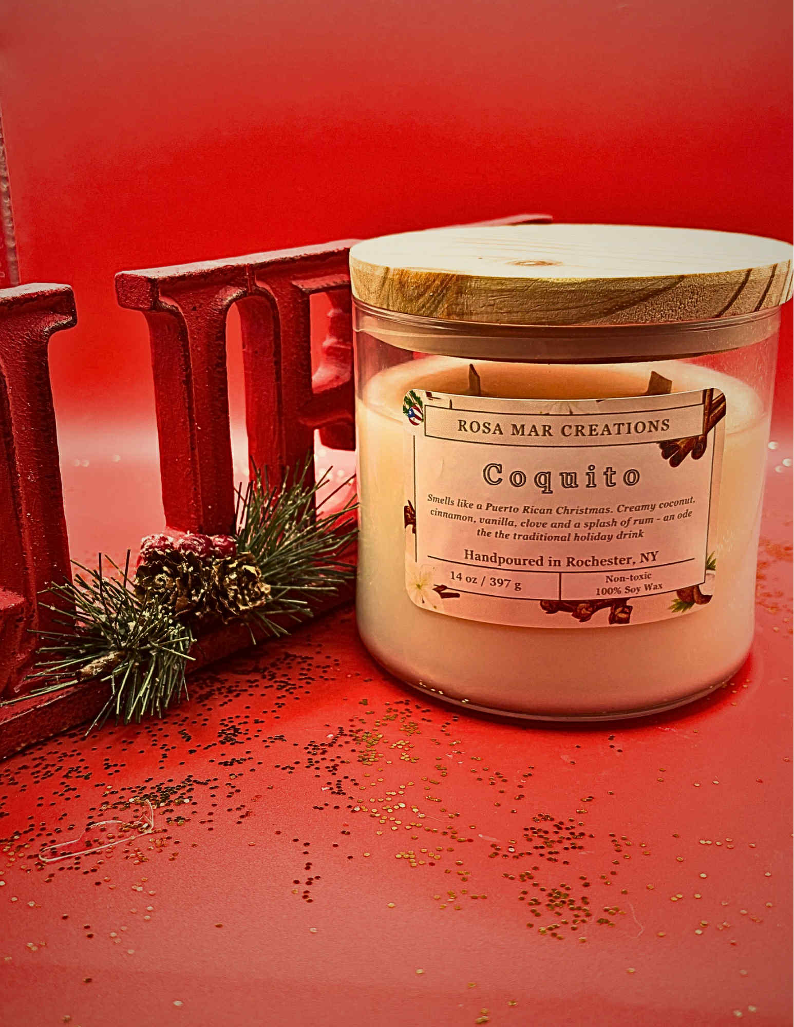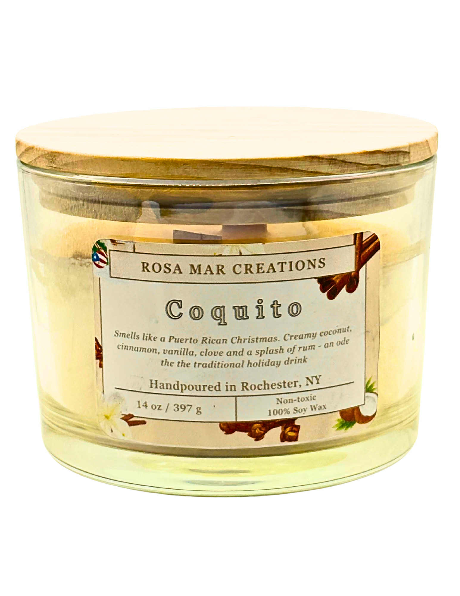 Inspired by the beloved Puerto Rican holiday drink, Coquito captures the essence of celebration and togetherness. With the comforting scents of coconut, clove, and vanilla, this candle fills your space with the warm, sweet aroma of cherished memories and festive nights.